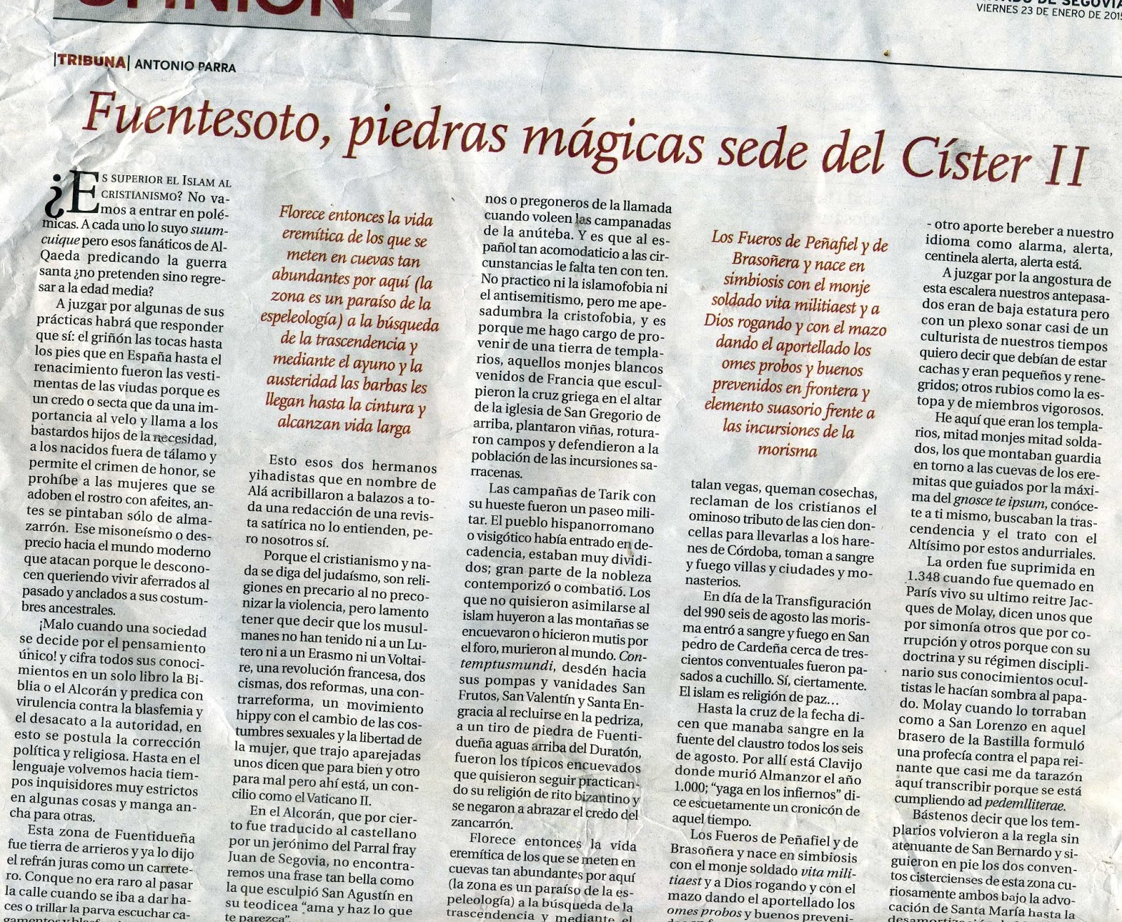 Posted: 04 Aug 2019 04:41 AM PDT SAN FRUTOS, ABOGADO CONTRA LOS MALOS TRATOS San Frutos abogado de las malcasadas protector de uxoricidios y que para, clemente, los golpes de los malos tratos y la violencia conyugal. Al que da una vuelta a su ermita no le volverán a doler los dientes Millán Sacramenia Artedo Le llaman "pajarero", seguramente, porque su fiesta, iniciado el otoño, coincide con la oleada de aves que cursan viaje hacia el sur y lo convierten en cangreja de místico velero, donde reposan el vuelo utilizando como descansadero a la impresionante cofa de este peñasco yermo que adquiere la caprichosa forma de portaviones inmóvil surcando la pedriza segoviana. Antes de reemprender el vuelo por el freo paran aquí o utilizan las escotaduras y socarrenas de las paredes cortadas a pico para anidar y quedarse. Abajo se prolonga una sima amenazante, pero por lo alto del risco encuentran posada y cantadero las aves tránsfugas, y sus píos causan embeleso a los ornitólogos. Son como partes de una letanía misteriosa repetida cada 25 de octubre sobre la cumbre que acomete el diácono de las silvas con harta solemnidad y empaque.Señor, misericordia, es el grito que entonan el jilguero, la avutarda, la aguzanieves y el monacillo por estos peñascos donde el alma se eleva y Dios parece estar cerca, casi al alcance de la mano, allí por donde las águilas y las vultúridas vuelan haciendo círculo, más que en ningún otro sitio. San Frutos es un santo que sabe mucho de pájaros y de "pájaras" puesto que conoce algo de las costumbres humanas a redropelo de todo pronóstico, se apartó del mundo no por menosprecio sino por amor a la condición humana cuyas debilidades no le fueron ajenas. Las bodas que se celebran en su altar no terminan en divorcio. Este eremita mozárabe, que nació en Segovia el año 642 y murió setenta y tres años después de vida penitente en el desierto tierras al norte de Sepúlveda - fue contemporáneo del último rey godo, del traidor obispo Opas y del moro Muza que inicia sus algaradas por el Estrecho a bordo de pateras-, brinda amparo, según cuentan, a los que andan en precario por causa de amores que se acedaron, es baluarte de acogida para las mujeres zurradas por la vida, víctimas de la incomprensión, la sospecha, para todos aquellos que andan en trámites de separación o están a punto de cometer un disparate. En fin, larga sería la lista de méritos y los prodigios a cargo de su varita de virtudes poderosa. Su venerable aura sigue ahí, encaramada en lo alto de la roca viva para el que se moleste en venir a rezarle salvando las fragosidades de un áspero camino. Por estas cumbres parece que se respira un aire distinto. Villa y Tierra lo quieren y se le venera en todos los sexmos de esta especie de confederación de judíos, moros y cristianos que era la zona de la provincia de Segovia, el arcifinio de todas las lindes, campos de pan llevar pendones y merindades, palenque de todas las espadas en los agobiados siglos de Reconquista, zona de frontera entre dos culturas diferentes y dos maneras de ver el mundo absolutamente opuestas. ¿Nos habrá nacido desde entonces este complejo de prevenidos en fronteras, de centinelas observantes del cotarro, siempre al acecho que hizo que el alma del pueblo español, acostumbrado a los palos, saetas y sufrimientos del contrario, tenga algo de aspillera? Es el sentimiento que al viajero le embarga cuando rinde visita a estos riscos. La ermita de san Frutos se yergue como un testimonio contra la intolerancia fanática, el desencanto de las cosas del siglo, y una exhortación a los buenos propósitos de la enmienda: lo que acaeció entonces puede volver a repetirse. Fue uno de los grandes santos intercesores hispanos, muy popular a lo largo de la Edad Media. Así lo destaca el Misal Mozárabe donde la fiesta de su tránsito era un día importante. La liturgia de san Isidoro, que es mucho más expresiva y poética, menos concisa y circunspecta que el ritual romano, como se sabe, le dedica nada menos que tres himnos de insólita belleza literaria, lo que indica que no es un santo de tantos en la lista de bienaventurados. Las rúbricas del Oficio Divino que acostumbran a despachar en dos líneas a san Acisclo, pongamos por caso, al anacoreta sepulvedano le apropian tres páginas de panegírico en elegante hipérbaton y salmos. La imaginería barroca nos le pinta con barbas apostólicas, una calva a cincel, el cerquillo penitente, en una mano un libro y en la otra, un cayado, la cachava de la cuchillada con que tajó la roca hurtando así su cuerpo de las gumías sarracenas que le pretendían degollar. Todavía queda la señal. Se abrió una sima entre la hueste agarena y el varón de Dios. Al abismo de san Frutos todavía se podrá asomar el visitante: una enorme garganta, y abajo, las aguas pandas y trucheras del Duratón, no demasiado profundas sobre el álveo calcáreo. Idóneo emplazamiento para ver nidificar al buitre o para suicidarse. Su estatua corona la entrada norte que algunos llaman también como en Burgos la del Sarmental de la catedral de Segovia, toda en granito y obra de Aniceto Mariñas. El ermitaño embebecido en sus meditaciones pero sin porte adusto y casi diríamos que risueño está mirando para un cantoral. La hoja de su libro está a medio pasar. Cuando esta página que pinga del vacío vuelva con las demás, es que se va acabar el mundo, según es crédito de radicación vulgar. La diócesis le tuvo gran devoción por éstas y otras muchas cosas. San Frutos vivió tiempos difíciles de cambios dramáticos y de desasosiego general como son todas las épocas de transición, cuando la historia pasa página. La batalla de Guadalete dio paso a la desbanda del 711. Empezaron las invasiones africanas, los arrasamientos y guerras prolongadas. Aceifas en masa. Venían y venían, cruzaban el Estrecho que desde entonces tan bien conoce el moro en oleadas. Seguramente la peste agarena fue un castigo que